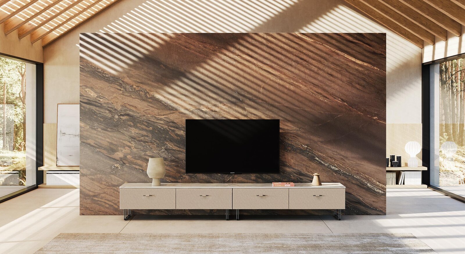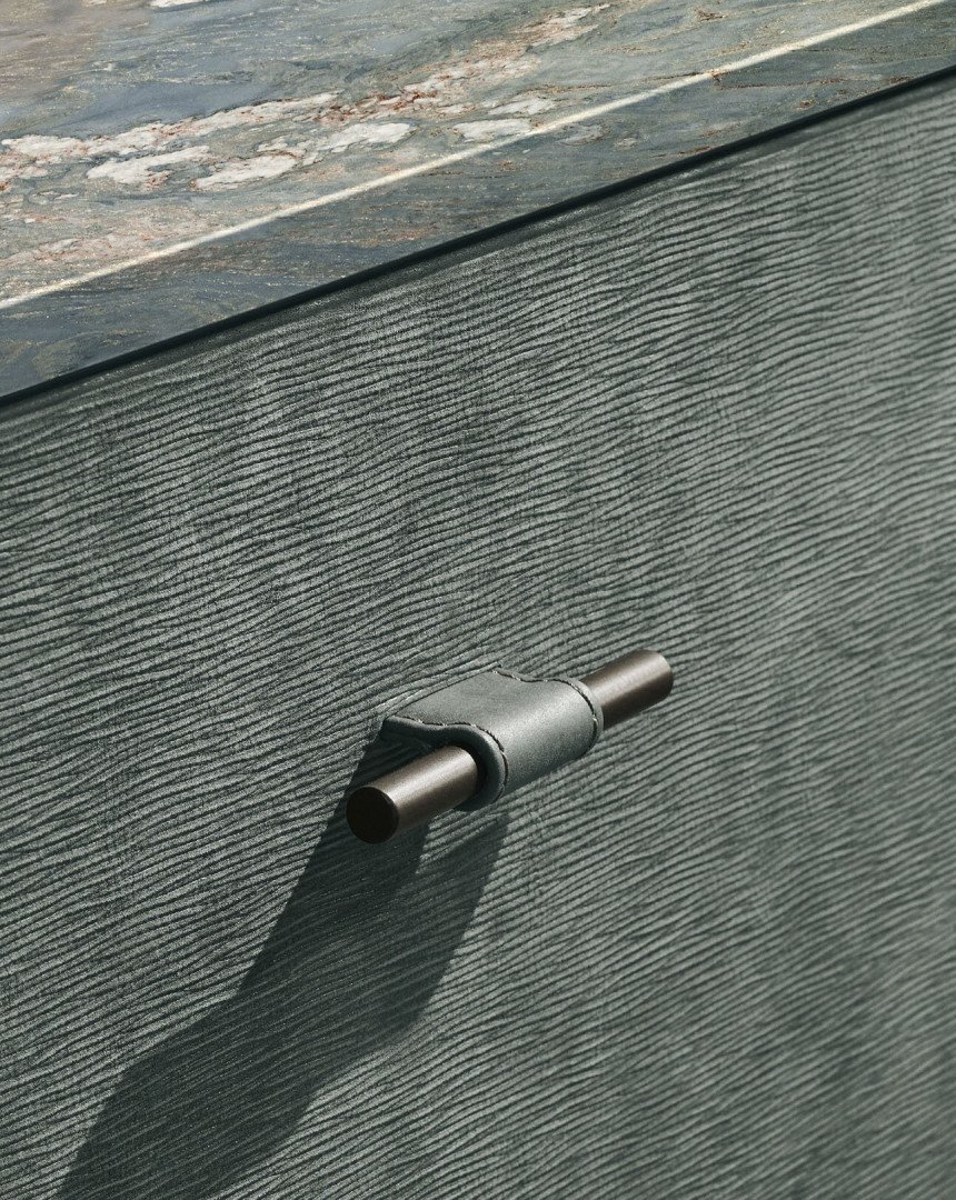 Structura din MDF este acoperită cu piele special tratată, iar clienții pot personaliza produsul, alegând dintr-o gamă de culori și finisaje. Fiecare modul de 80 cm include un sertar extensibil cu glisare dublă soft-close și se sprijină pe o bază elegantă din tuburi metalice duble, care conferă un aspect ușor și elegant. Clientul poate alege blatul dintre sticlă fumurie, ceramică sau marmură. Ușile dulapului acoperite cu piele se deschid cu un mâner metalic al cărui finisaj și formă amintesc de baza. Atât mânerul, cât și baza sunt disponibile în toate finisajele noastre metalice. Cu finisajele sale rafinate, materialele de calitate premium și detaliile atent selectate, acest dulap TV este o piesă de măiestrie care se potrivește oricărui mediu sau proiect.