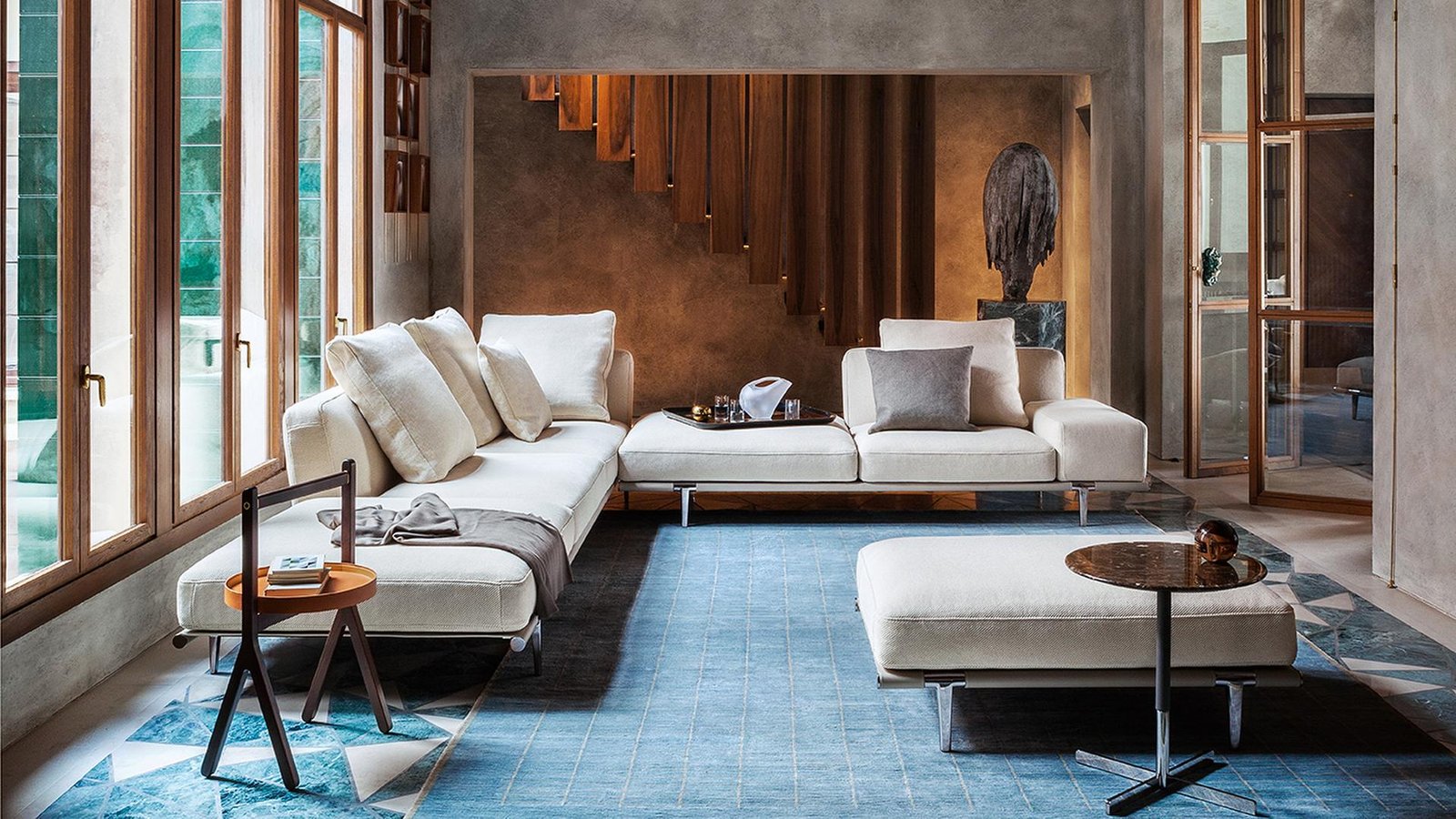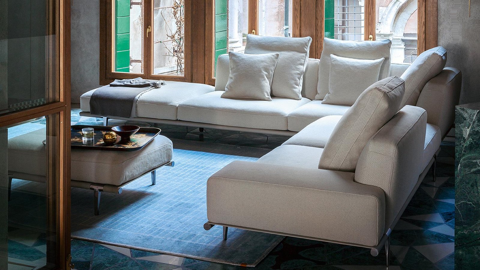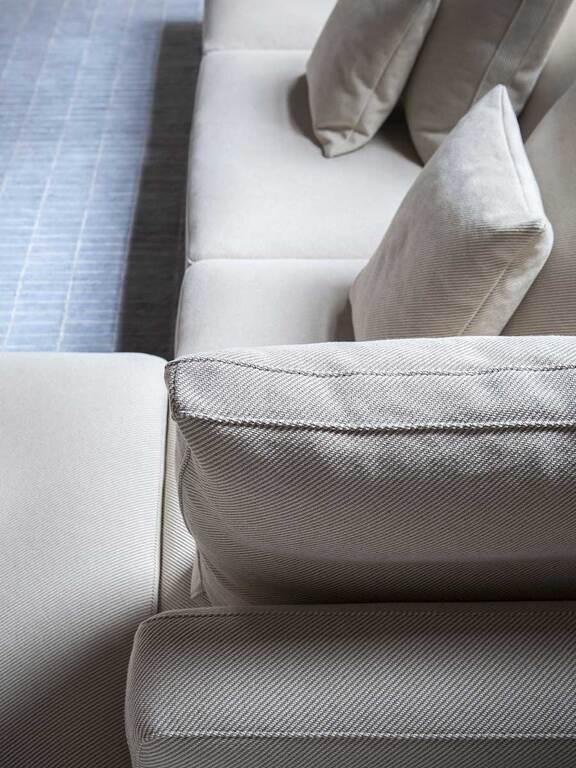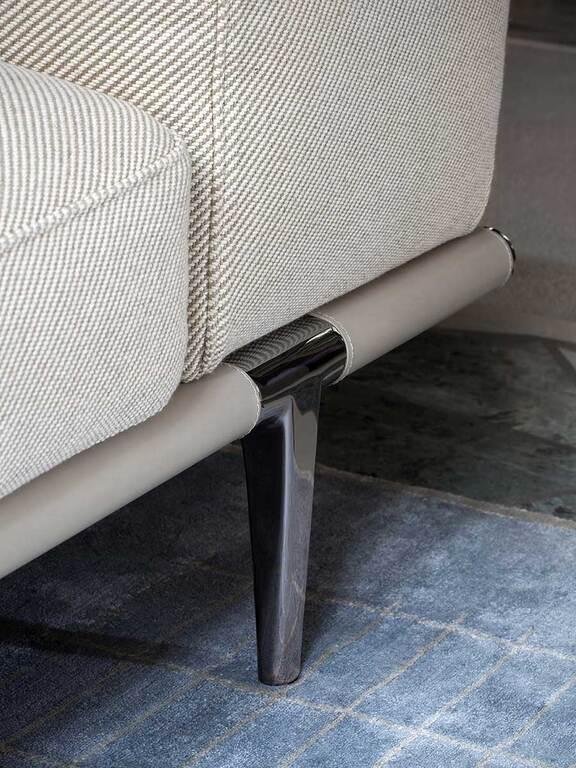 Structura și pernele sunt tapițate cu piele Pelle Frau®, combinată și cu material textil. Alternativ, piele Saddle combinată cu piele Pelle Frau® sau material textil. Suprafețele rafturilor și ale brațelor sau spătarului sunt tapițate cu piele Saddle. Cadru din aluminiu turnat cu îmbinări din oțel vopsit în negru. Structura spătarului și a brațului, căptușită cu spumă poliuretanică și vată poliesterică, este realizată din plop masiv și placaj de mesteacăn. Sistemul de arcuri al șezutului constă din curele elastice împletite. Perna șezutului este căptușită cu pene de gâscă și vată poliesterică. Picioare din aluminiu turnat, disponibile în două înălțimi, cu finisaj ruthenium sau ars și lustruit.