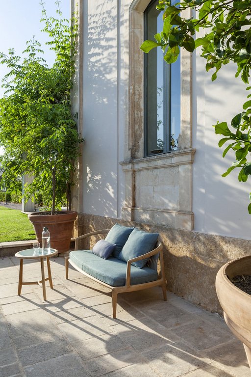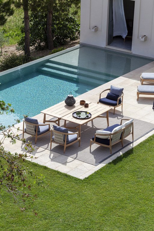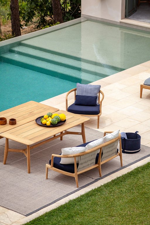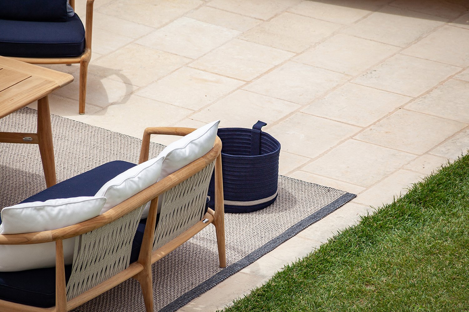 Canapea de exterior cu două locuri, din tec cu finisaj natural, ideală pentru terase, verande, grădini sau punți de yachturi. Designul îngust și organic exprimă o măiestrie impecabilă. Spătarul este realizat dintr-o împletitură de bumbac în două tonuri (ecru și taupe), care susține perne detașabile, în opțiuni de două sau trei. Umplutura permite scurgerea apei și uscarea rapidă. În combinație cu fotoliul și masa joasă creează un spațiu informal de dining. Lemn certificat FSC™ 100%.