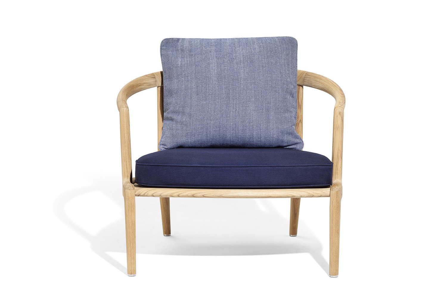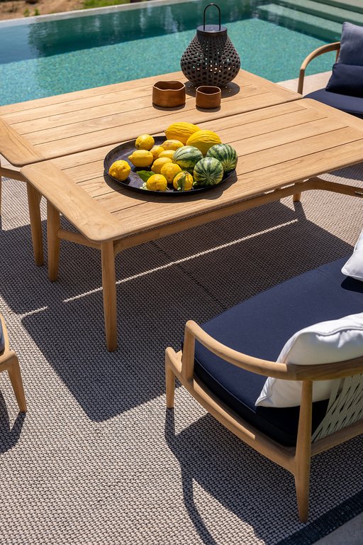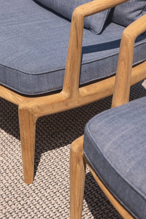 Fotoliu de exterior din lemn de tec masiv, finisat natural, caracterizat de o execuție impecabilă. Împreună cu canapeaua și masa joasă formează o zonă de dining informală. Spătarul este din împletitură de polipropilenă bicoloră (ecru și taupe), cu perne detașabile. Se poate adăuga pernă pătrată pentru spate și pernă lombară. Umplutura este gândită pentru exterior. Design de Roberto Lazzeroni, parte a colecției Boundless Living Outdoor.