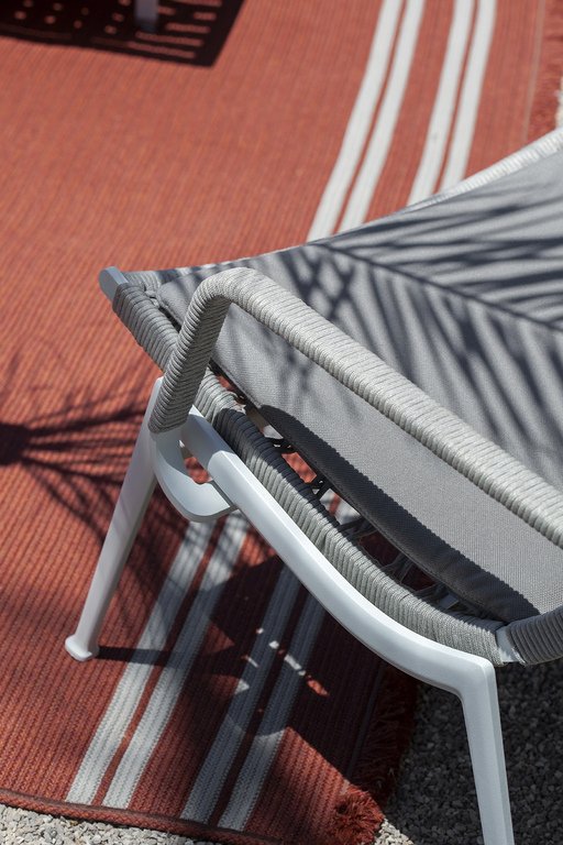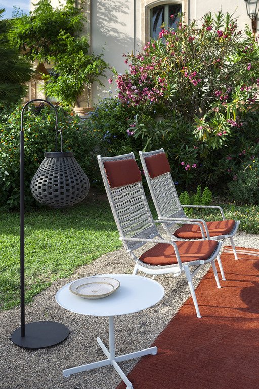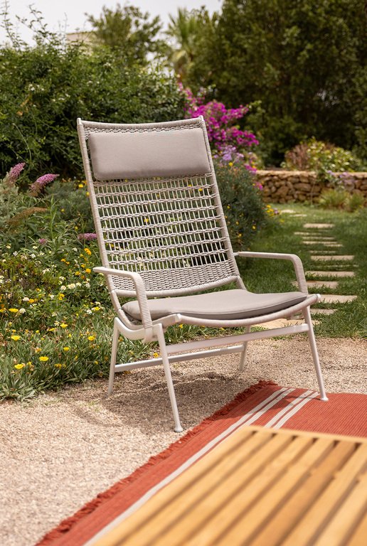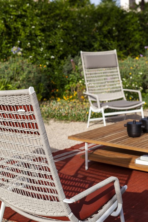 Fotoliu de exterior cu spătar înalt și cotiere, ideal pentru momente informale în grădini, verande sau punți nautice. Spătarul înalt este împletit manual, creând efecte de lumină și transparență. Se poate adăuga o pernă de sprijin pentru cap sau o pernă de șezut. Face parte din colecția Solaria de la Poltrona Frau.