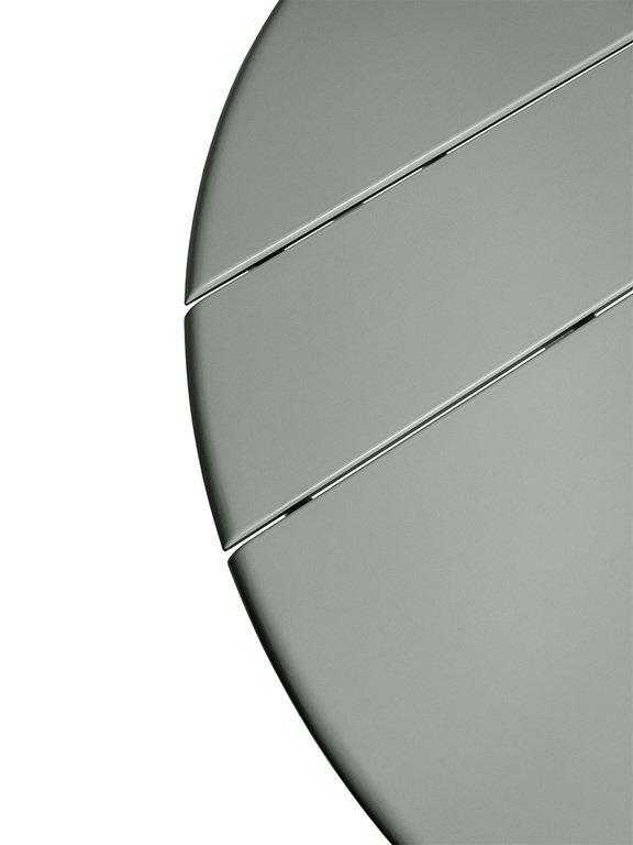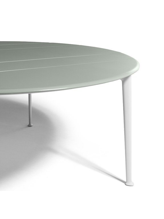 Masă rotundă de exterior Solaria: blat din lamele de lemn (Teak sau gresie glazurată); cadru din oțel inoxidabil vopsit; picioare din aluminiu turnat vopsit; lemn certificat FSC™ 100%; disponibilă cu sau fără orificiu central; include husă de protecție.