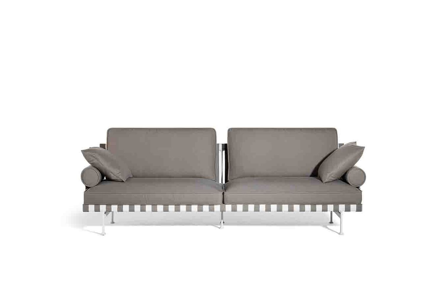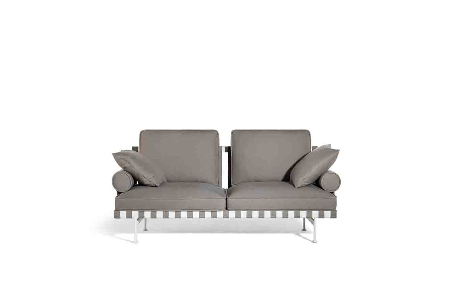 Canapea de exterior cu două locuri Souvenir d'Italie: lejeră și informală; benzi elastice din polipropilenă împletită; picioare din aluminiu turnat; cadru din aluminiu cu grinzi ovale; perne mari cu paspoal și spumă cu două densități; cotiere cilindrice simplificate; estetică casual și deschisă.