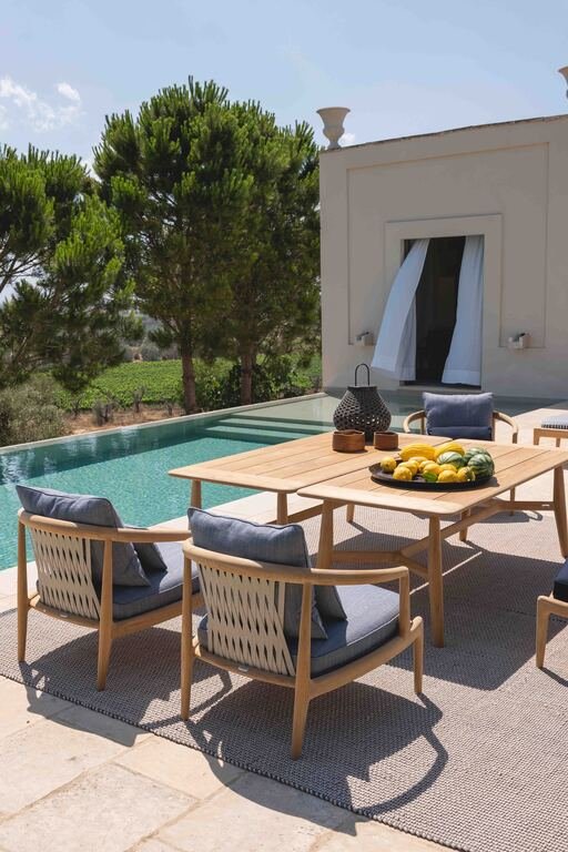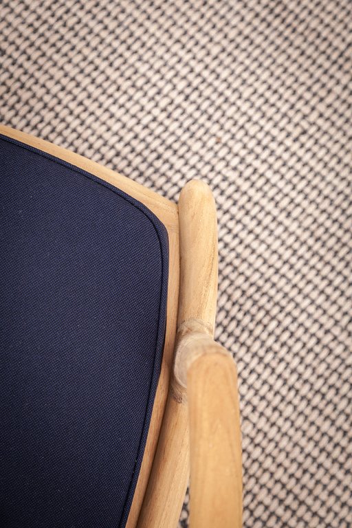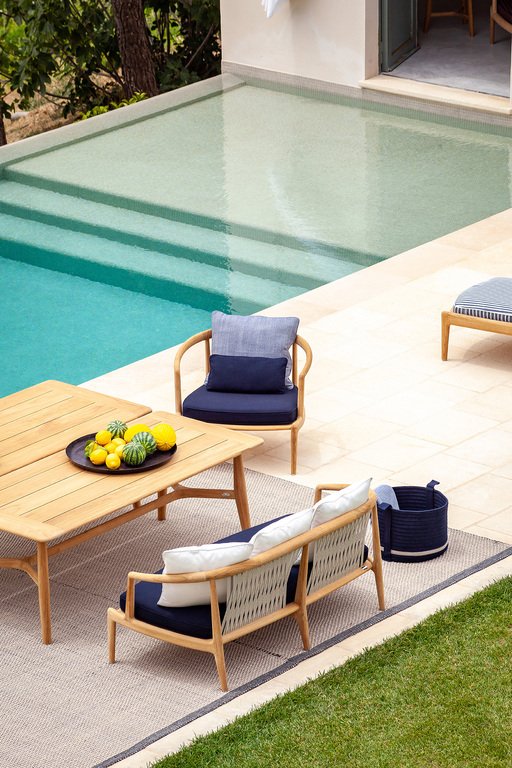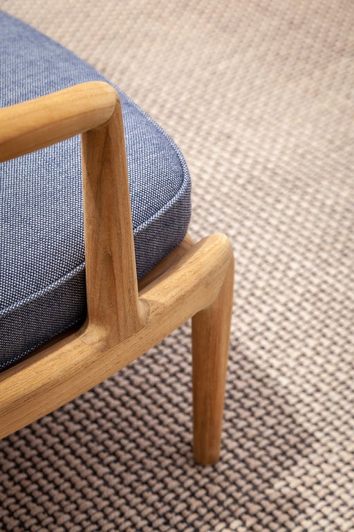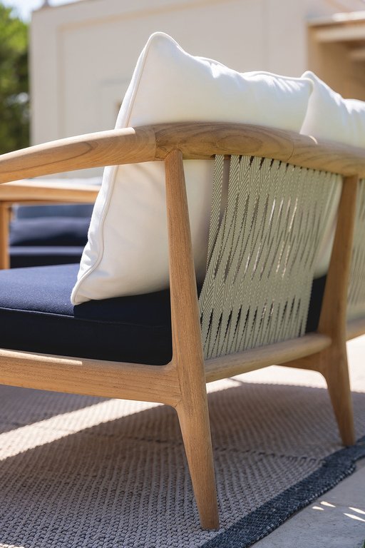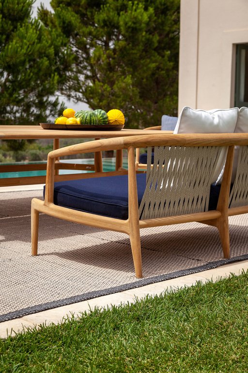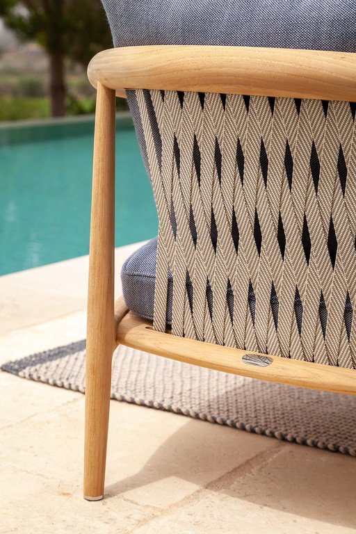 Fotoliu The Secret Garden: lemn masiv de tec certificat FSC™; formă care îmbrățișează corpul; configurație informală pentru dining; spătar împletit în două nuanțe; perne de exterior detașabile; umplutură cu uscare rapidă.