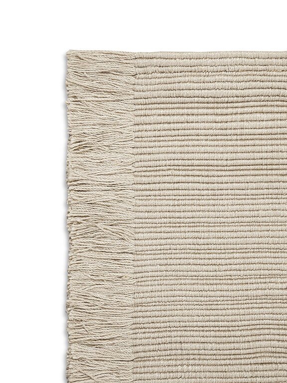 Covor de exterior Kabir: țesut manual din PET 100% reciclat; design minimalist; rezistent la intemperii; atingere moale; disponibil în mai multe culori; ciucuri pe marginile lungi.