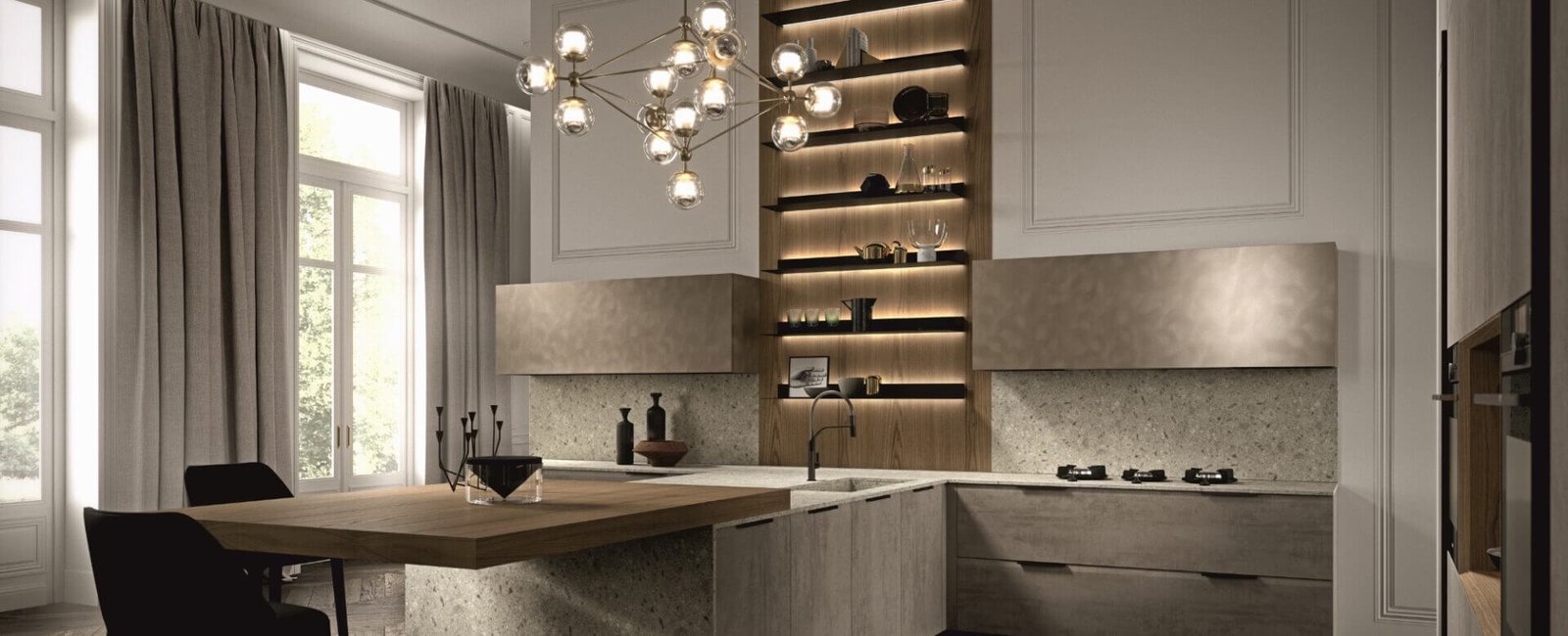 Aster kitchens combine striking aesthetics with advanced functionality. Every detail is ergonomic: hidden storage, multi-functional islands, push-to-open systems, and integrated LED lighting. Beauty meets high-tech innovation in every corner.