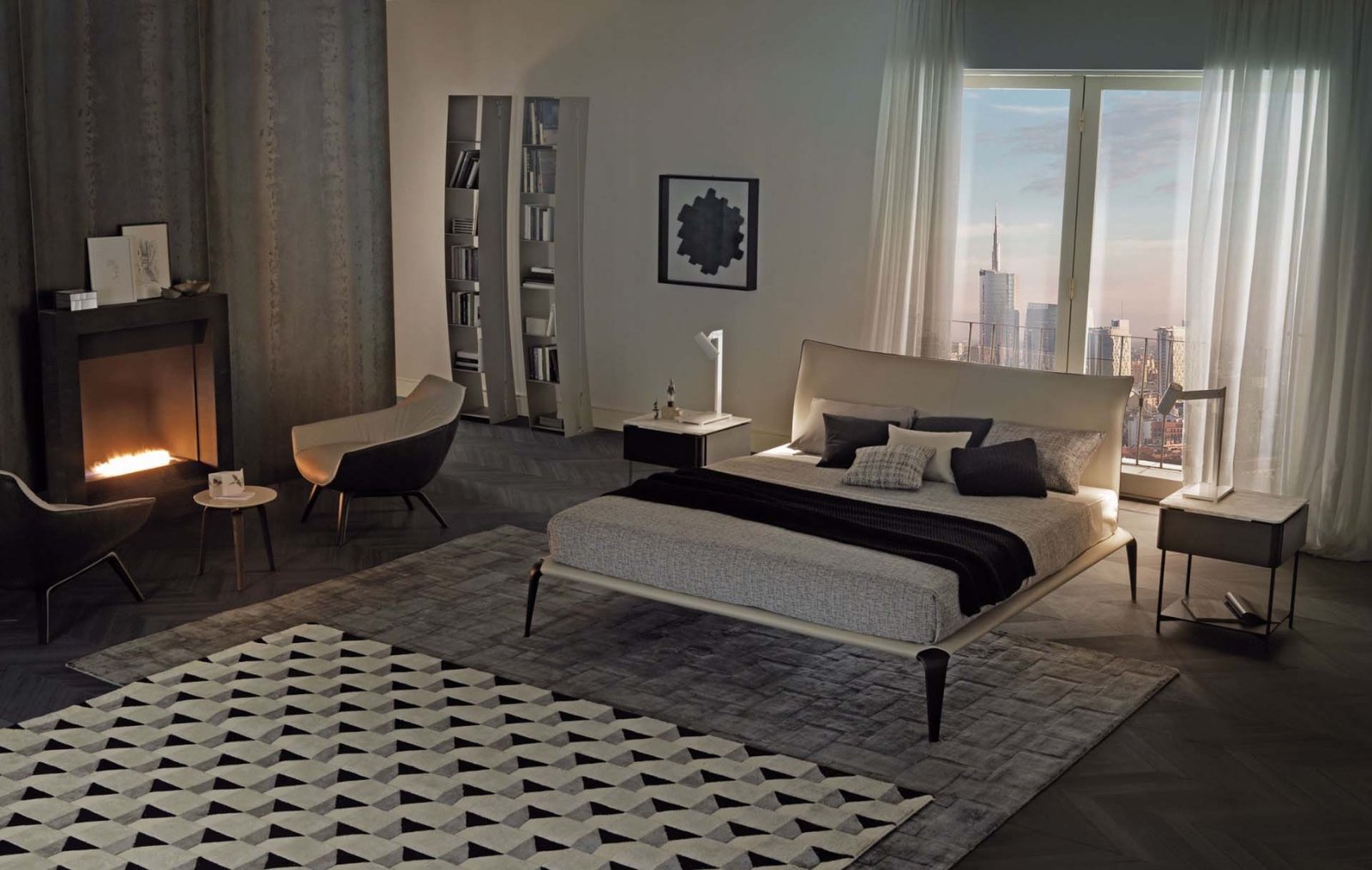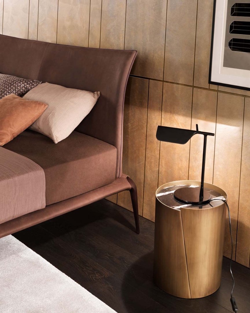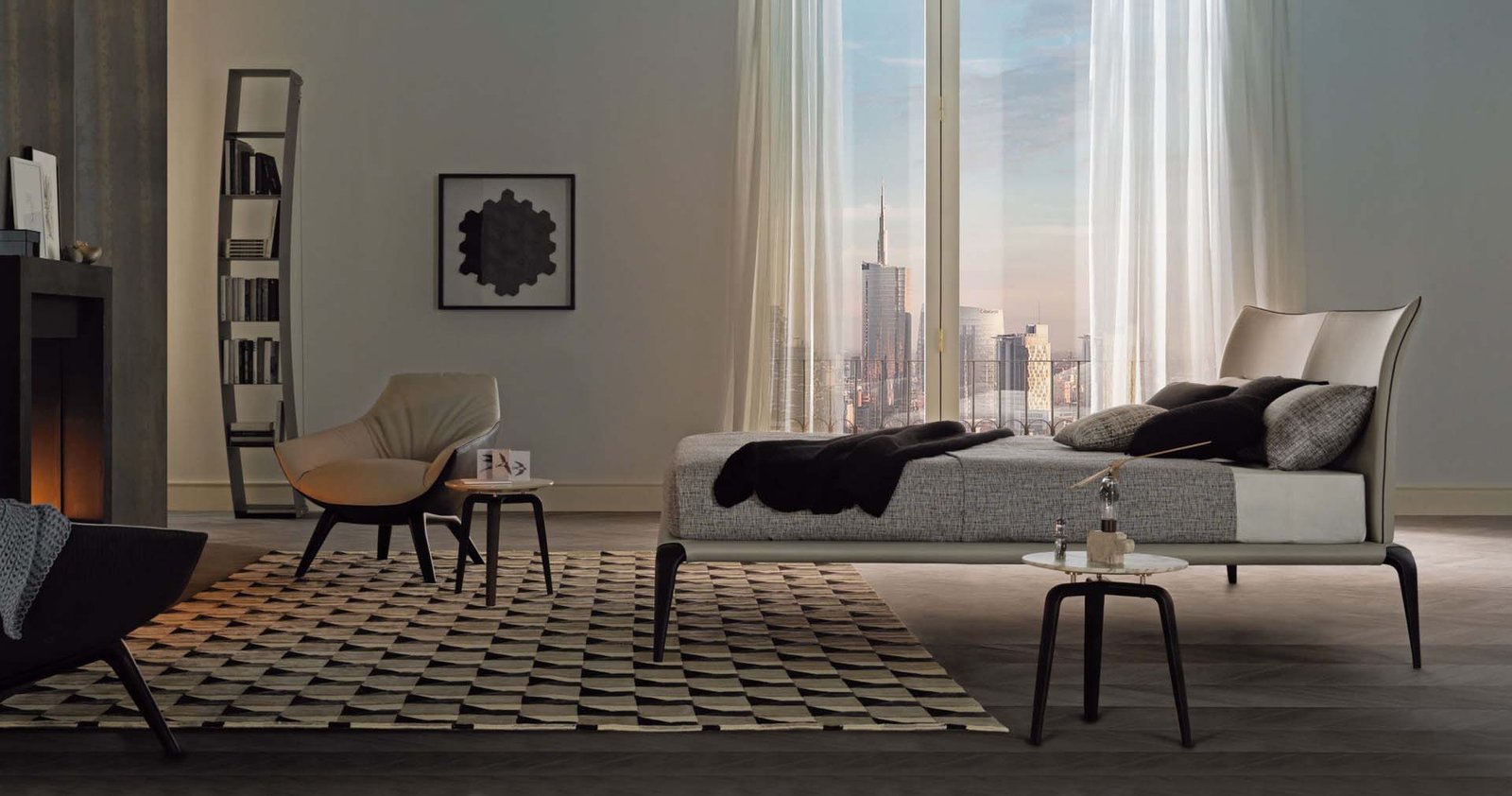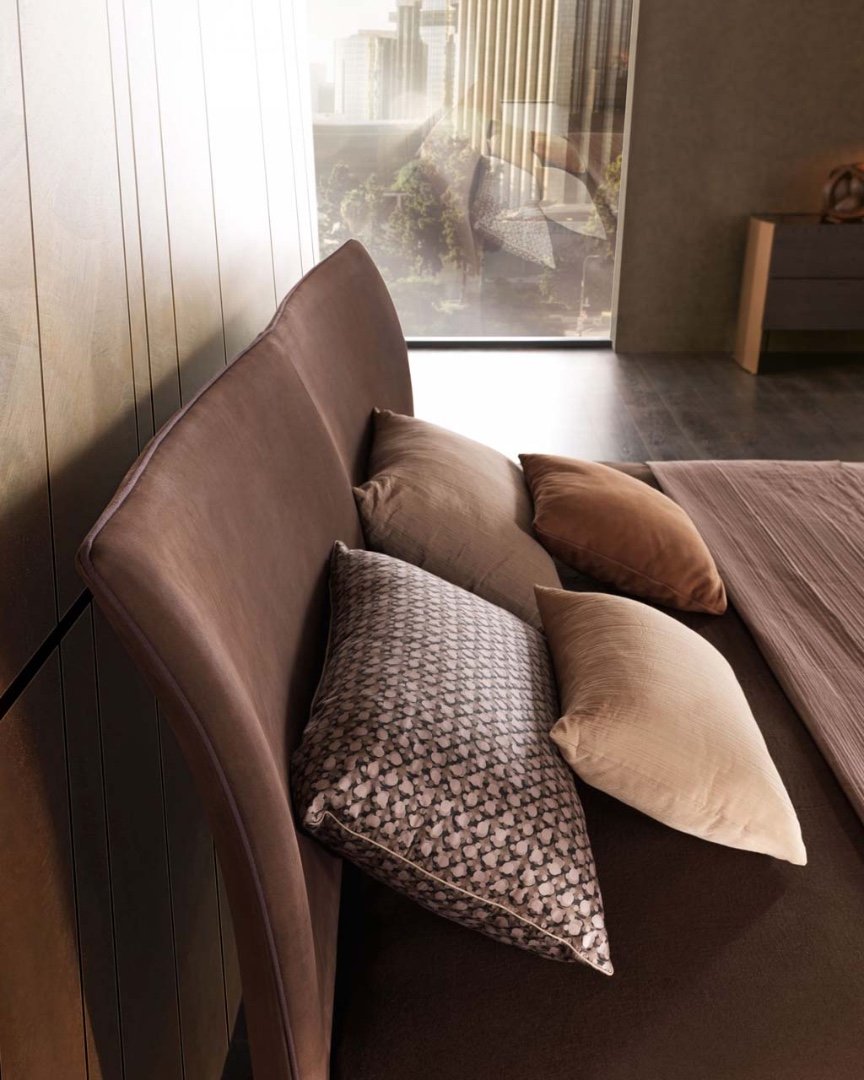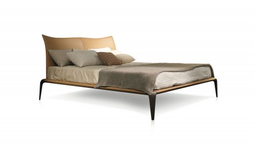 The Margareth bed is a well-balanced mix of elegance and exclusivity, with its light and ethereal design, combined with the most advanced technological materials. The steel headboard, covered in leather, eco-leather, or fabric, and seamed with a sophisticated handcrafted detail, creates a seductive look. The solid wood base is also upholstered with matching fabric, enhancing the design of the solid wood foot shape supporting the bed.