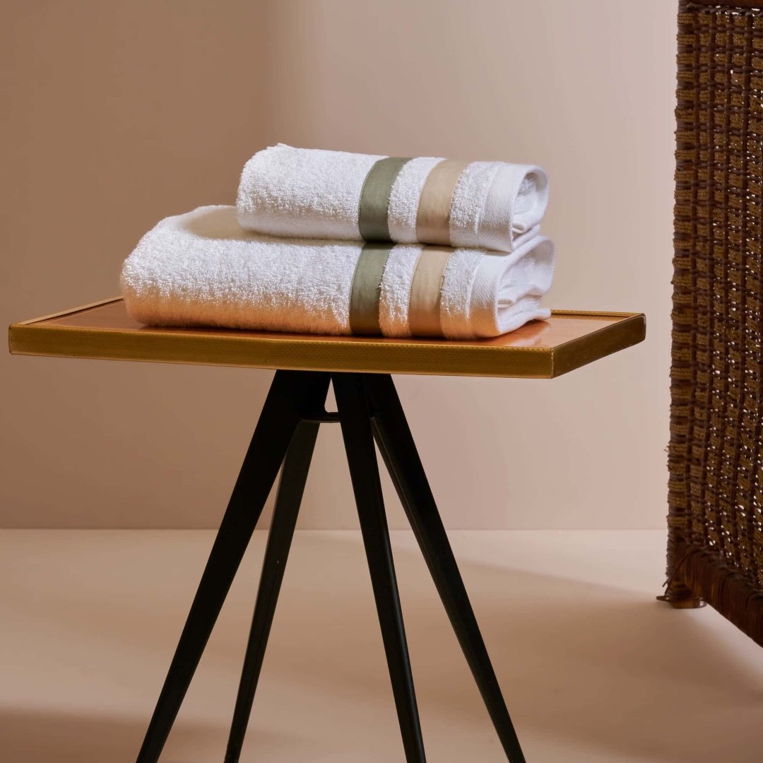 Antigua Bath Towel de la Biancoperla, realizat din pure cotton terry 530 GSM, cu dungi decorative. Un prosop cu textură moale și finisaje elegante.