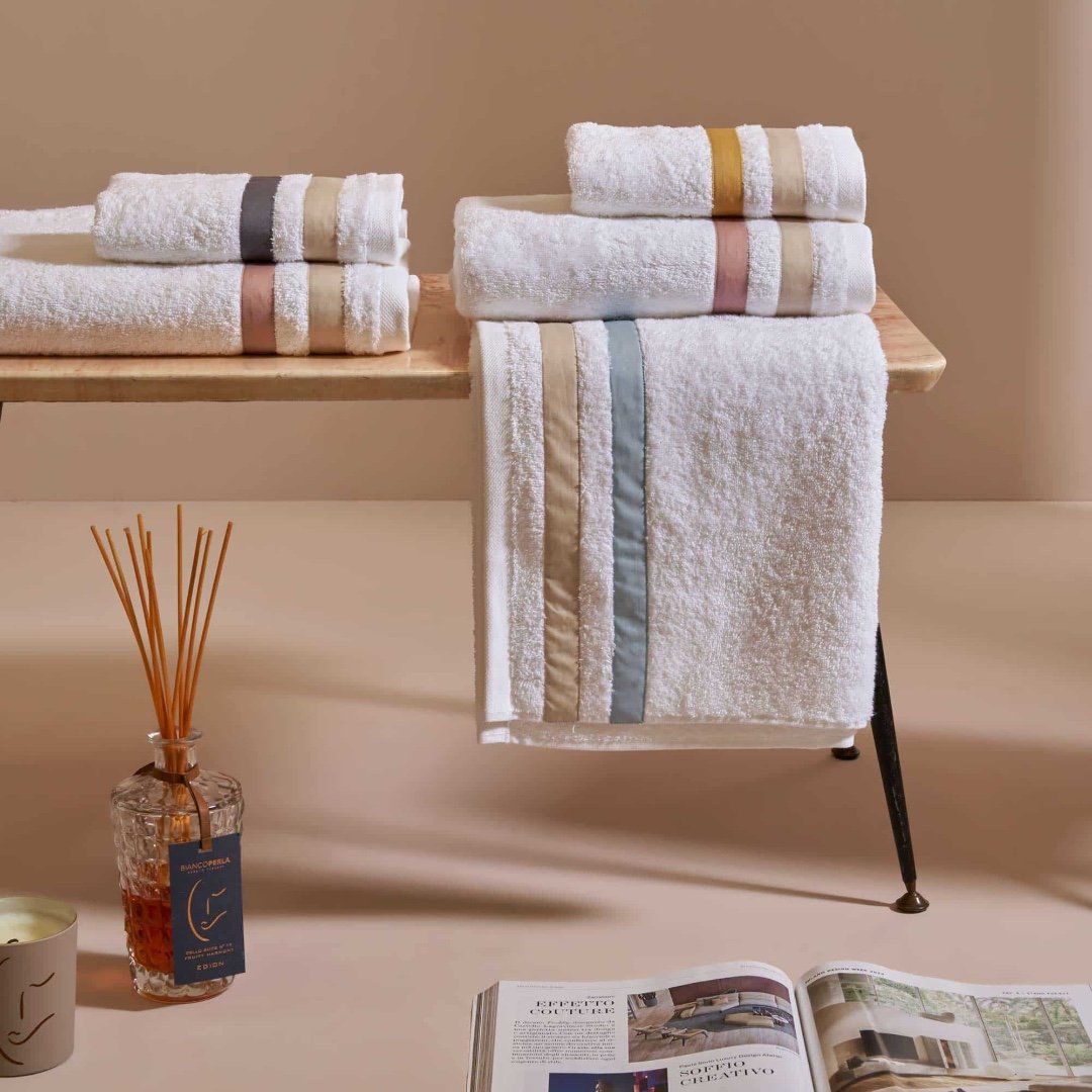 Antigua Set de la Biancoperla, realizat din pure cotton terry 530 GSM, cu dungi decorative. Un set de prosoape cu textură moale și finisaje elegante.